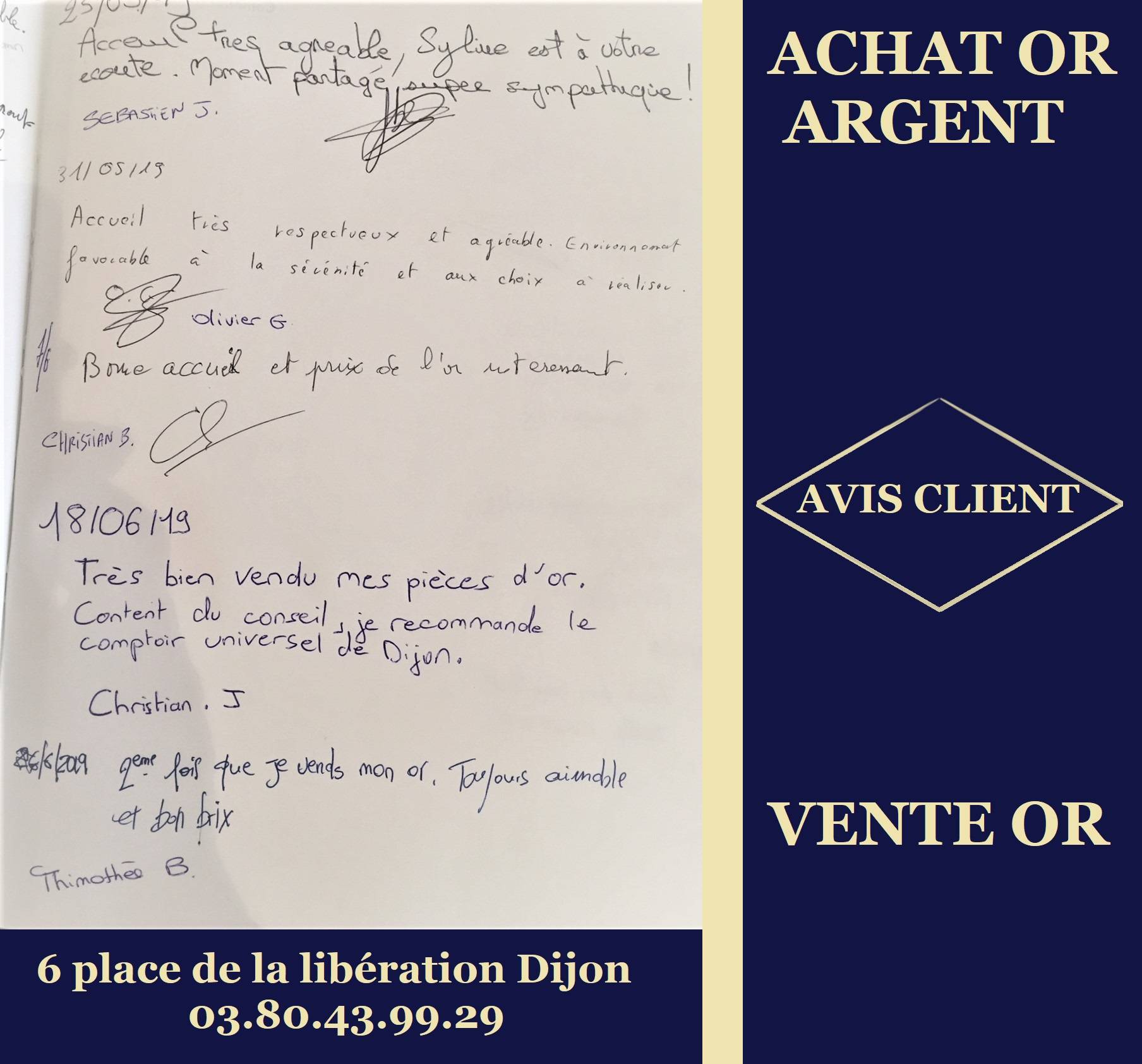 A Dijon et dans tous nos comptoirs d'achat or, vous disposez d'un livre d'or dans lequel formuler votre avis. Il est important de consulter les avis d'une clientèle, quand ceux ci sont écrits de leur main.